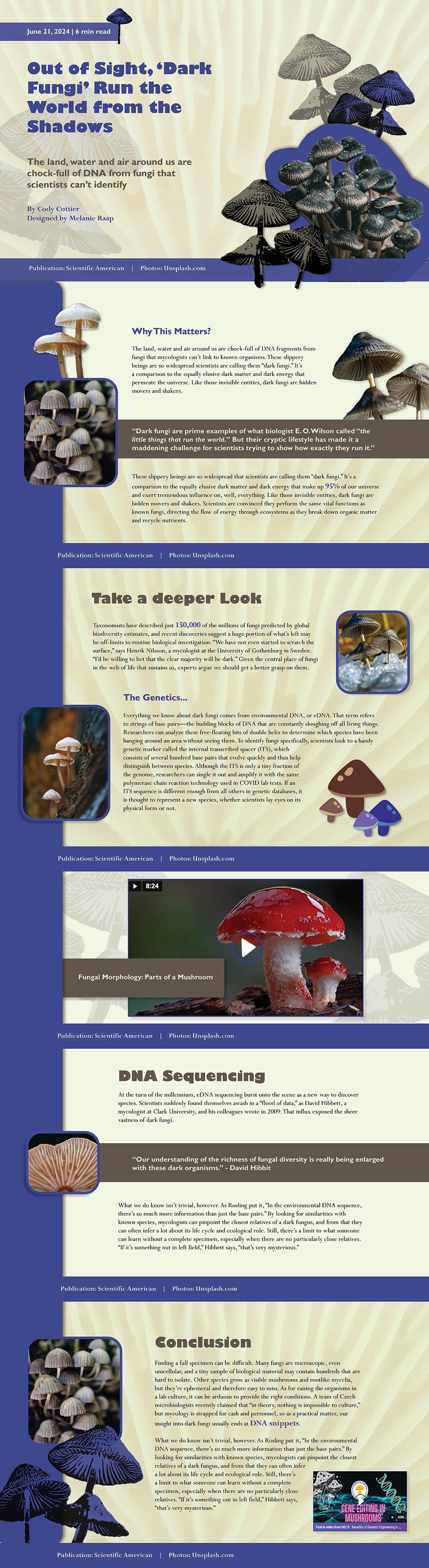 This project was a UI/UX designed article configured for an iPad. The article discusses the science behind fungi and how they interact with the world around them. The style derives from heavily contrasted comics, giving a fun and exciting insight for the user before they start to read. The color choices come from the perception of where fungi grows, like in dead areas of a forest or mushrooms in general having colors that are muted (some species vary). Since this focuses more on dark fungi, I thought incorporating a deep contrasted violet would suit the article for standing out more to its audience.