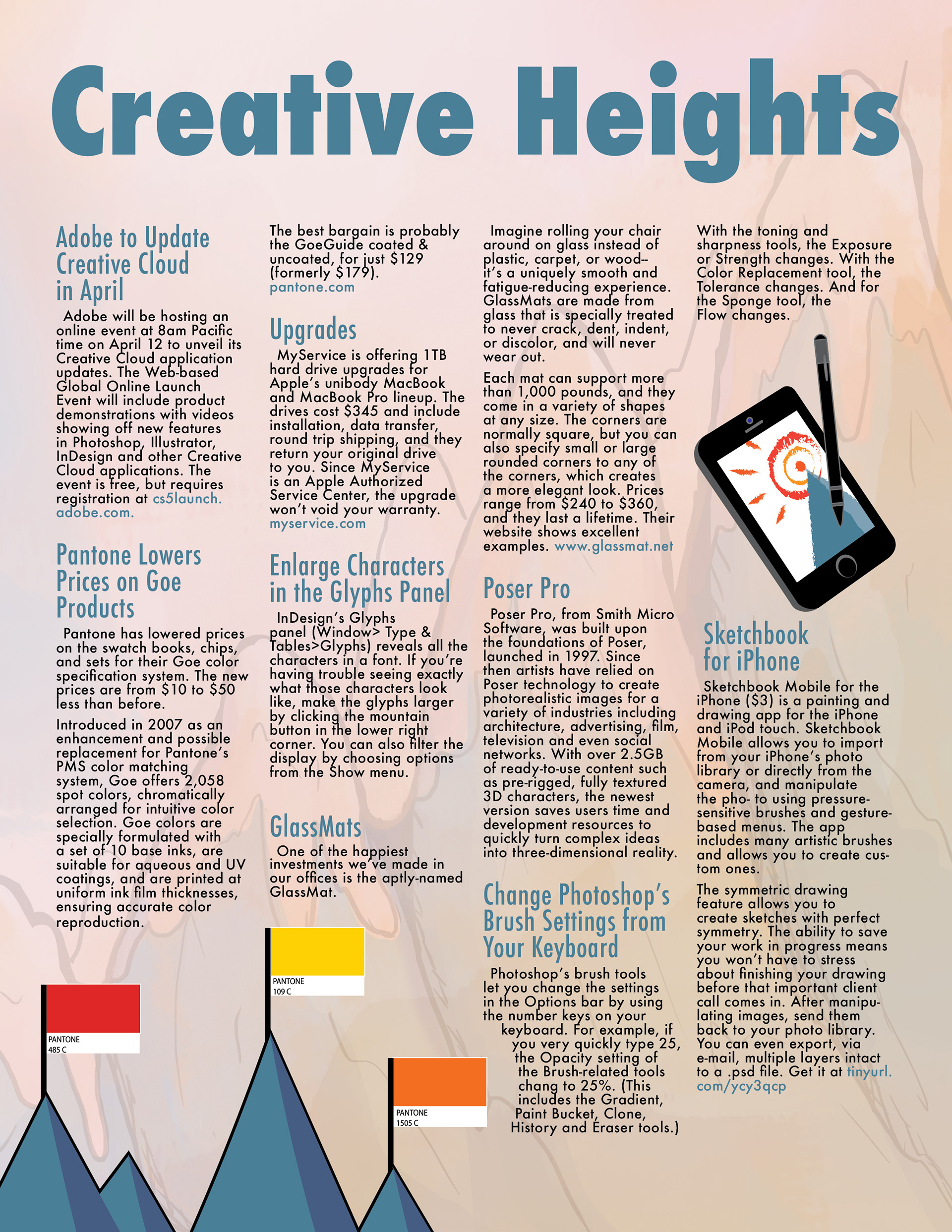This is a newsletter that discussed the latests updates to Adobe. These included new shortcuts, tools, and preferences the user can choose from (this was designed when Pantone and Adobe creative suite were merged).